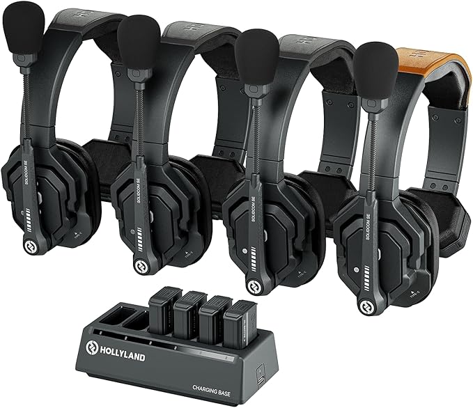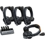 • Includes 4 headsets (1 master + 3 remotes), enabling full-duplex communication without base stations or belt packs.