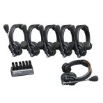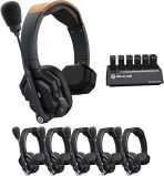 Includes 6 headsets (1 master + 5 remotes), enabling full-duplex communication without base stations or belt packs.