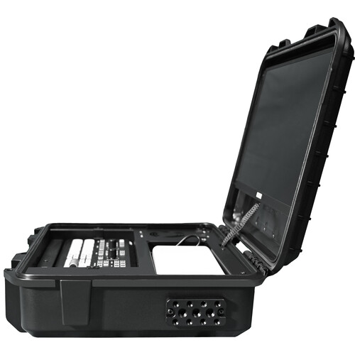 The kit is designed to be portable and easy to carry. It includes a monitor and protective case, making it suitable for mobile productions and on-location streaming.